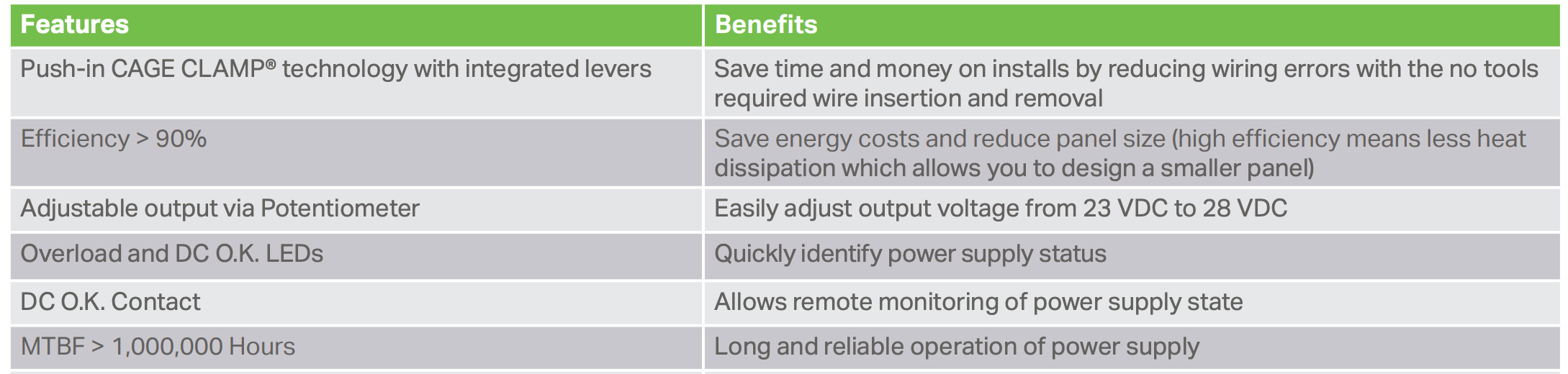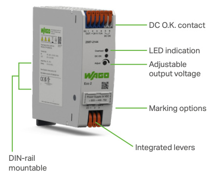 The Eco 2 Power Supply family is expanding with the addition of the 2687-2144 Eco 2. The 100 VAC … 240 VAC, 50/60 Hz, 1-Phase input, 24 VDC, 5 A, 120 W output supply is ideal for many repeatable applications. At just 38 mm wide, the slim-style power supplies maximize space in your control cabinet. Pushin CAGE CLAMP® technology with integrated levers allow for tool-free installation. This new device is also extremely reliable and reduces energy costs with a high efficiency rating of up to 90%. Convenient marking options, LED indications, DC O.K. contacts, and adjustable output voltage make this power supply an excellent choice for many OEM applications.